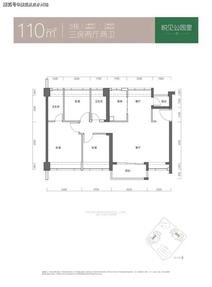 110㎡的3房2厅2卫,设计的是横厅大开间格局,客厅5.8米开间,南北通透双阳台,三开间朝南,3个卧室分别做到了3.4米/2.9米/2.6米的宽度,U型厨房,公卫三段式分离,得房率73.71%(不含赠送),阳台主朝西南或东南向。