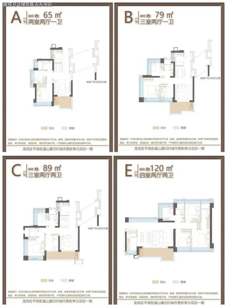 产品为建筑面积65㎡的2房2厅1卫,79㎡的3房2厅1卫,89-100㎡的3房2厅2卫,120㎡的4房2厅2卫户型。