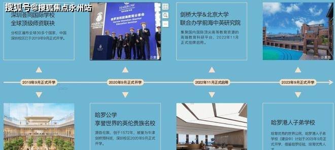 世界著名学校英国哈罗公学(已开学)、哈罗港人子弟学校(在建中)、美国荟同国际学校(已开学),以及剑桥大学&北京大学联合办学前海中英研究院(已开学)