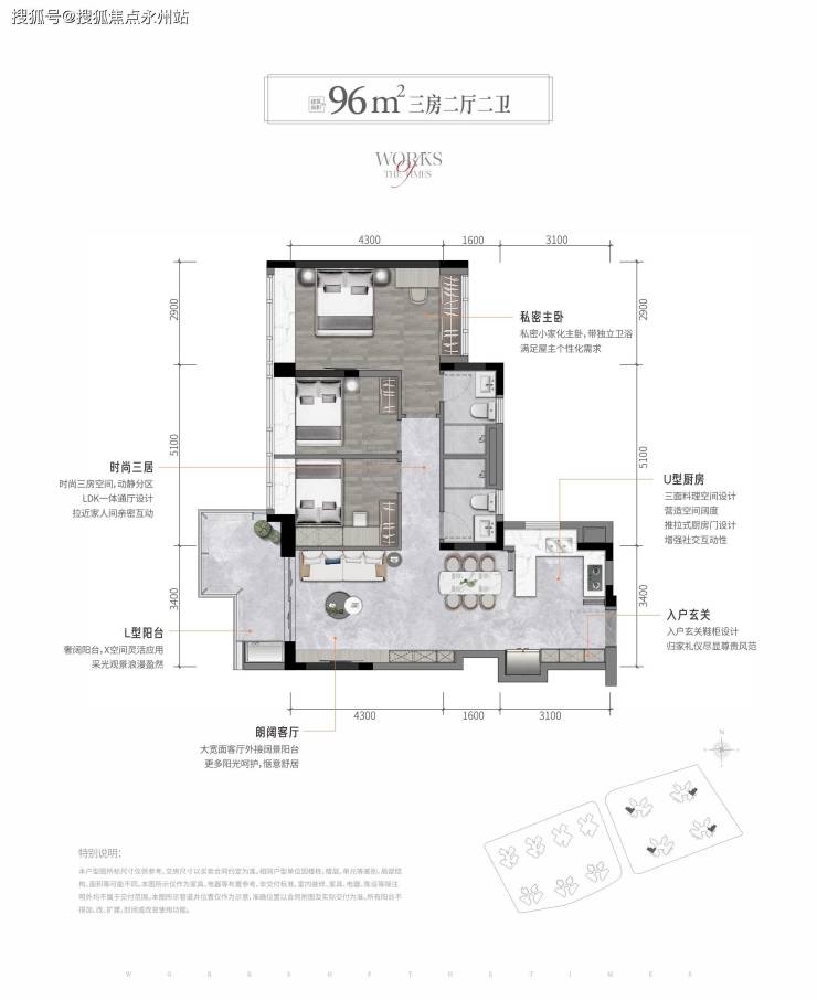 建面约94㎡的三房两厅两卫的产品共有两种户型。