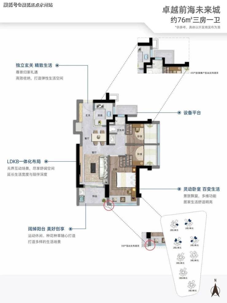 76㎡的3房2厅1卫,设计的是竖厅格局,进门入户玄关,客厅3.05米开间,LDKB一体化,S墙设计预留冰箱位,3个卧室分别做到了2.95米/2.3米/2.15米的宽度,U型厨房,卫生间三段式分离,还带1个设备平台可以使用,得房率约:76.69%(不含赠送),阳台有朝东北、东南或西南向。