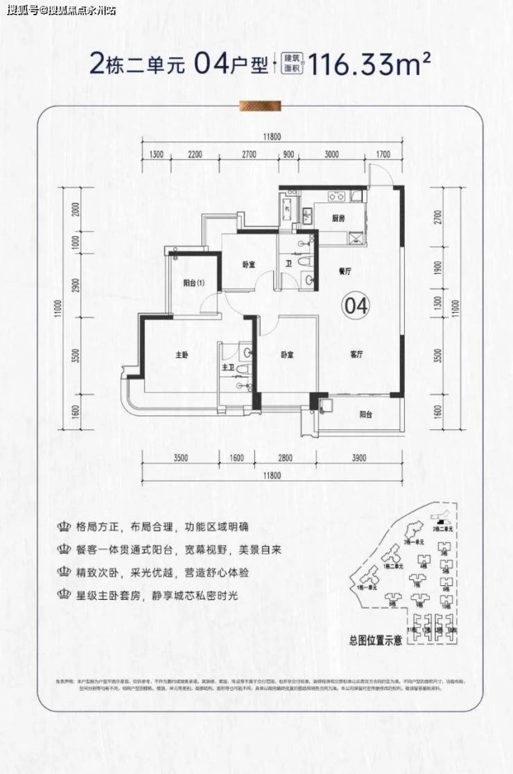项目户型介绍:社区产品面积段包括112-116-120㎡4房2卫,195㎡4+1房4卫,本次推出116户型4房2卫