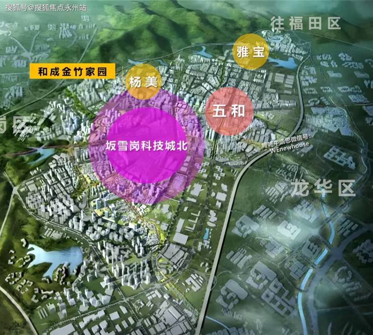 和成金竹家园,位于龙岗区坂田街道环城路与发达路交汇处东南侧,作为华为全球总部基地所在的坂雪岗科技城,紧挨龙华区,这里可谓是龙岗不可或缺的一部分,在2022年GDP高达2252亿元,占比龙岗全区66%,也一度占据龙岗榜首,该片区重点发展现代通信技术、新型显示、云计算、下一代互联网、高端生产性服务和高标准、高品质城市公共服务等,打造成为国际知名的通讯技术与计算机技术研发和总部为主导的综合性新城区。