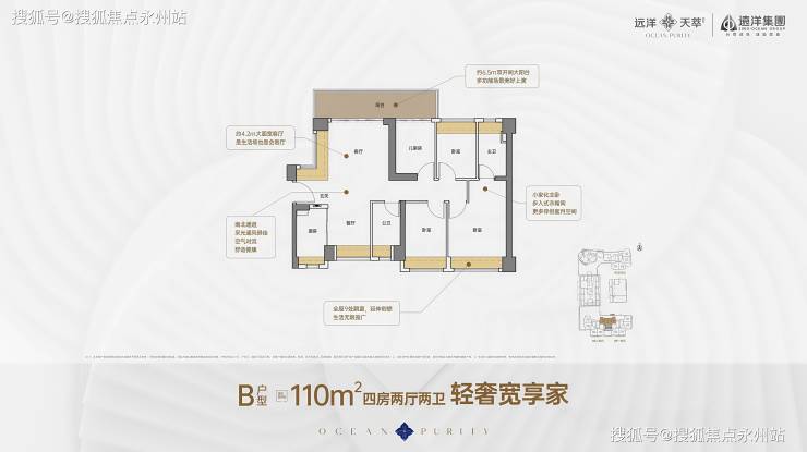竖厅格局,客厅3.5米开间,LDKB一体化,S墙设计预留冰箱卡槽位,客厅连接次卧出5.9米长的大阳台,主卧双面飘窗,次卧270°转角飘窗,全屋6面飘窗,U型厨房,卫生间干湿分离。