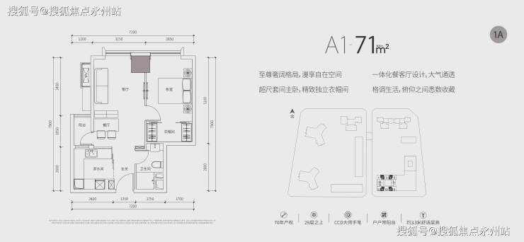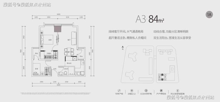 (公寓)推售约67-87㎡1-2房,均位于29层之上高区,享百米以上景观。70年产权,户户带阳台,拥有3.3m超舒适层高。室内公区、样板房均由CCD香港郑中设计事务所设计,将高级定制融入每一寸居住空间