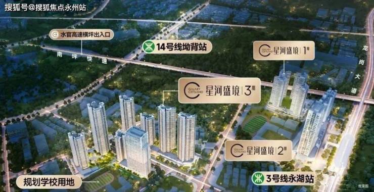 「星河盛境3期」位于龙岗·3号线永湖站附近,是一个建面约26万㎡的综合大盘,业态有住宅、商业、办公、公寓。