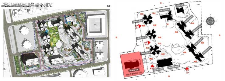 小区的车库出入口位于小区西侧与香逸名园相邻,小区的大门及主要人行出入口位于小区南侧临新闻路,小区的主要商业布置在1栋6-8单元三座住宅楼底部,幼儿园位于西北角。