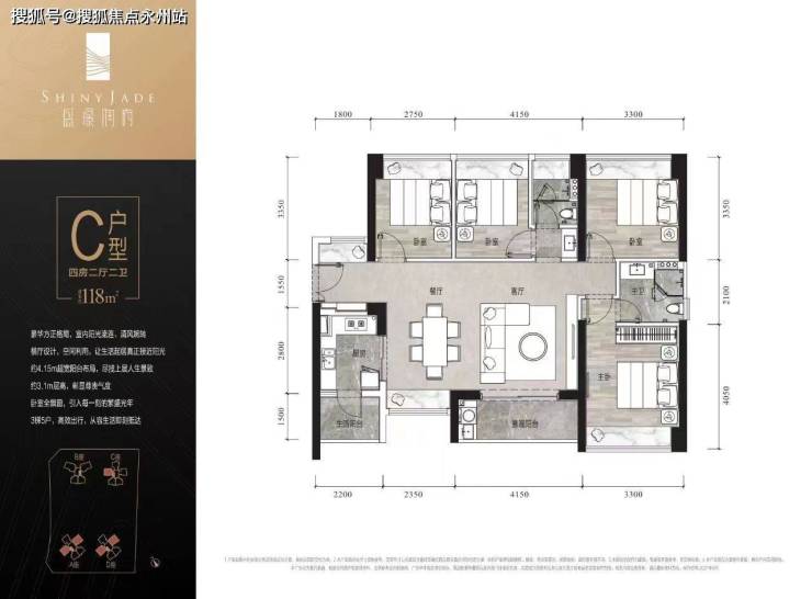 C户型118㎡4房2厅2卫:东南/西南朝向,6.5米大横厅,住出大四房的即视感;无承重墙设计的双儿童房,可分可合。