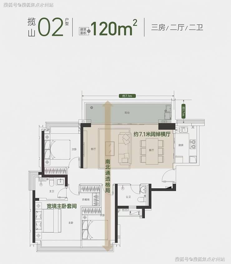 03户型 约120㎡3房2卫:双龙抱珠户型,三开间朝南,双阳台设计,该户型为正南朝向,户型方正,双阳台,三开间朝南,能实现三面宽采光“双龙抱珠”设计的居住格局,中庭为厅,主客卧分布于客厅两侧,在提高空间利用率的同时,也能显著提高居住的私密性,主卧套房设计,带观景浴室,双阳台设计,主阳台进深约1.5米观景阳台,拥有270°向外视野景观,俯瞰安托山,生活阳台连接双面操作厨房,还能看塘朗山景观。