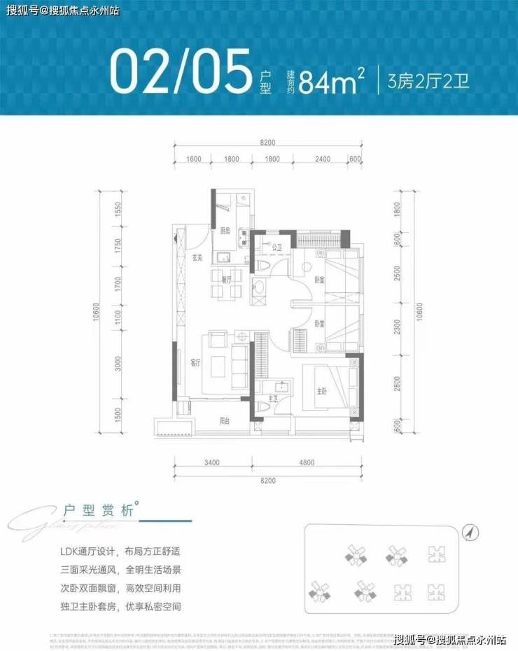 84㎡的3房2厅2卫,设计的是竖厅格局,进门入户玄关,客厅3.4米开间,LDKB一体化设计,三开间朝南,3个卧室分别做到了3米/2.5米/2.3米的宽度,U型厨房,公卫三段式分离,得房率:77.62%(不含赠送),西南或东南朝向。