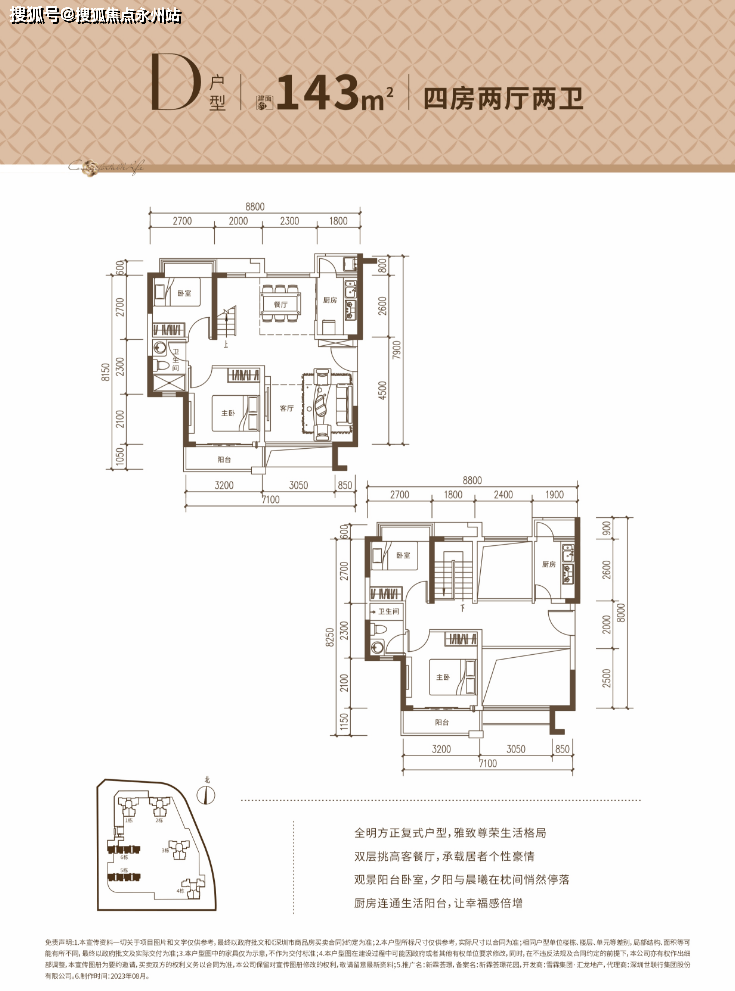 D户型:约143㎡4房2卫2阳台 (复式洋房)正南朝向【楼栋】5、6栋