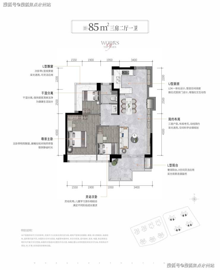 建筑面积约85㎡户型:东南活西南朝向,动静分区布局。主要生活空间南向,餐客厨等宽,公共空间联系紧密。客厅带有L型阳台,空间利用灵活,功能全面,可兼顾家政空间。主卧开间进深比良好,空间舒适明亮。双次卧分布均衡,小房间配置L型飘窗,空间利用充分。分离式卫生间,满足高峰期家庭实用需求。入户预留收纳玄关和冰箱位,一体收纳空间。
