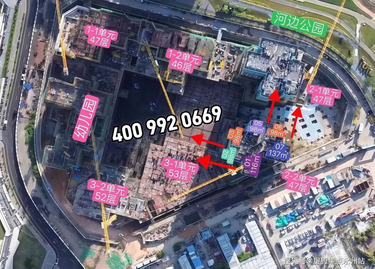 共由6栋总高46-53层的住宅组成,其中1栋1单元、2栋1/2单元47F,1栋2单元46F,3栋1单元53F,3栋2单元52F,5栋是1所18班幼儿园。