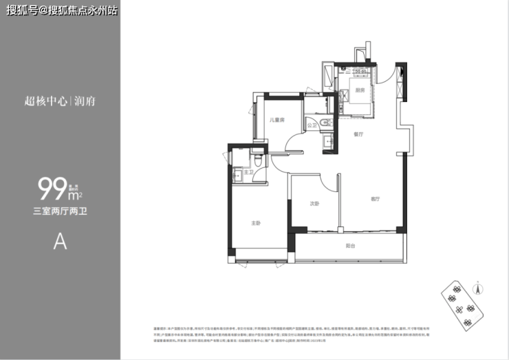 建面约99㎡户型是项目的主力产品,为传统竖厅动静分区结构,次卧和客厅共享面宽约6.2米阔景阳台,空间更通透,超大的南向面宽,让人视野通透,神清气爽,次卧之外,主卧和儿童房都有飘窗,提升了空间利用率。
