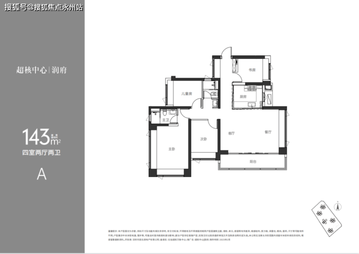 建面约143㎡四房两卫户型,整个户型双面采光,公共空间格外宽敞。除了跟客厅共享阳台的次卧外,其余3个房间,甚至连主卫,都采用凸窗设计,除了增加采光,也增加了空间的通透和使用率,3梯4户的梯户比、南北/东西通透,客厅景观几乎无遮挡。