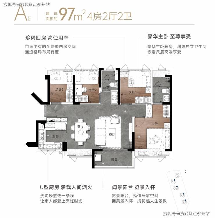 项目针对不同家庭需求,推出73-97㎡三至四房户型,均采用高得房率设计(80.3%-80.4%,不含飘窗),并通过创新布局实现空间高效利用。