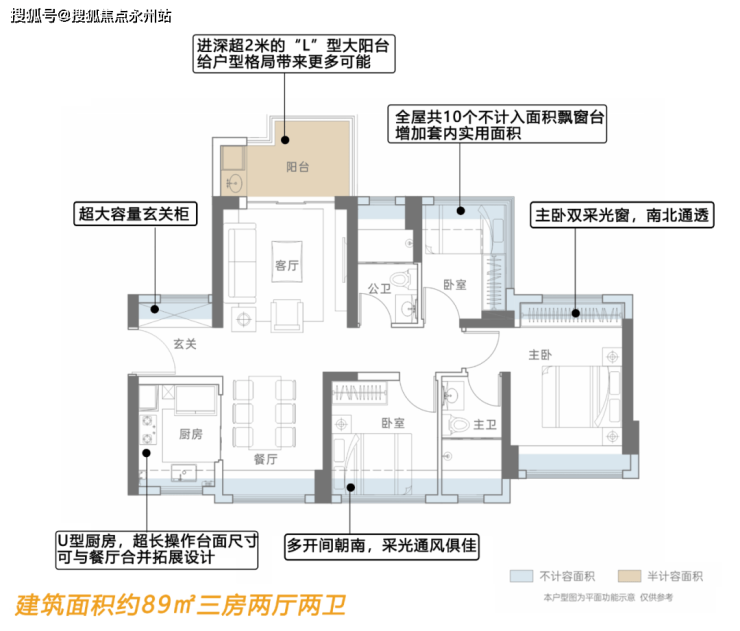 ●配备局部进深达2.1米、约6.2㎡的L型大阳台;