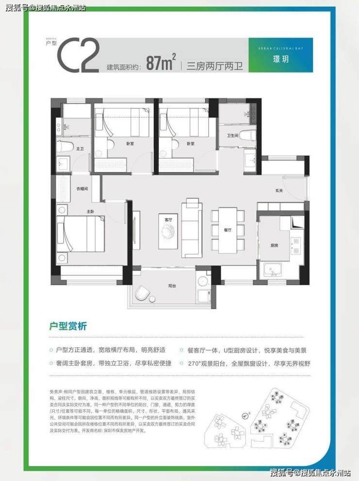 约87㎡三房两卫(1栋2单元03/04户型、3栋1单元05/06户型、3栋2单元04户型、5栋05户型)横厅格局,餐客一体化,卫生间干湿分离设计,有东南朝向、西南朝向。