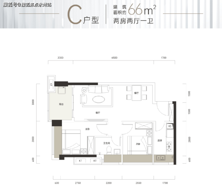 建面66平的2房,很方正的设计,厅出阳台、全明格局