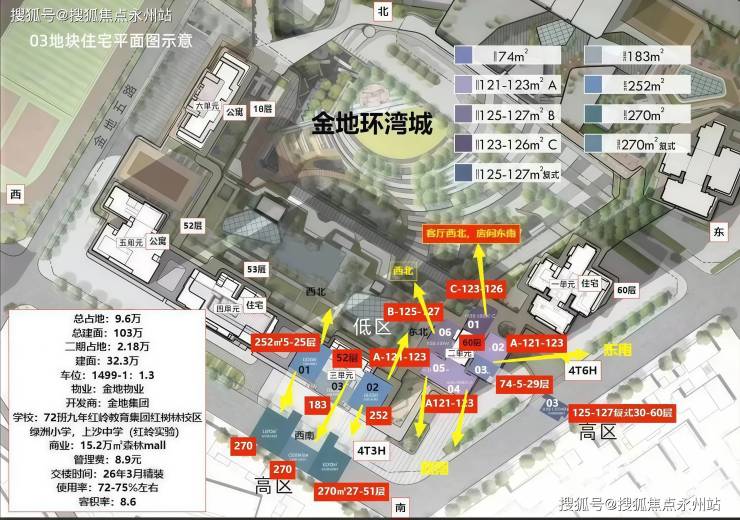 03地块T7/T8(1/2单元)为4梯6户,共60层高,T9/T10栋(3/4单元),4梯3户,52层高。