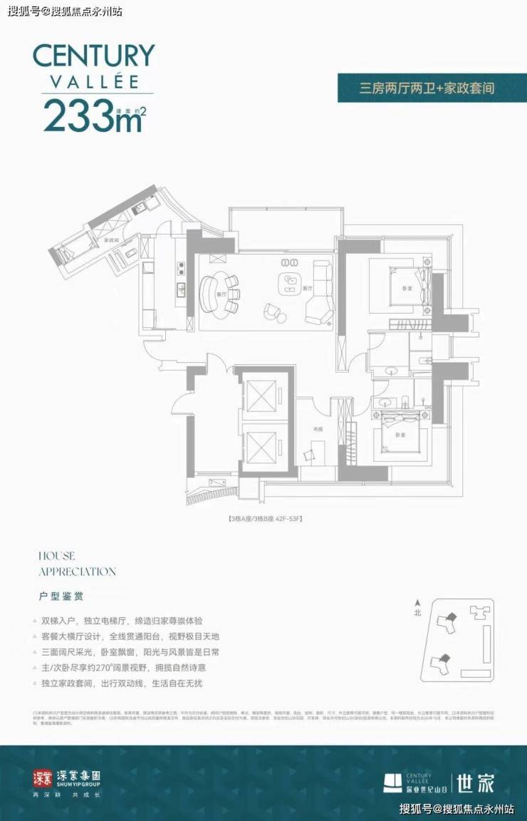233㎡的3房2厅2卫+家政套间,仅3栋A/B座A户型,双梯入户,设计的是横厅格局,客餐厅7.9米开间,动静分区,主卧大套间约24㎡,大次卧约19㎡,小次卧约14.82㎡,另外还有独立保姆套房,一字型厨房,得房率约78-82%(包含赠送),约11.4㎡观景大阳台,西北朝向,看高尔夫景观