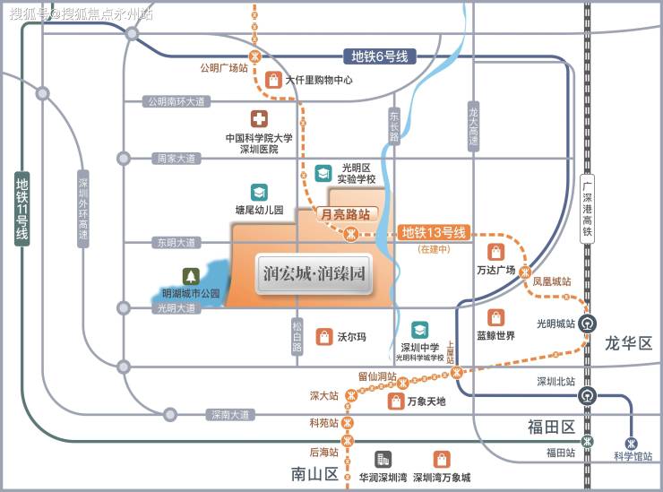 目前一期北段已进入试运行阶段,二期北延段(含月亮路站)预计2025年底贯通运营,未来可串联东莞松山湖、深圳湾总部基地等科创走廊。此外,3站可达光明城高铁站,搭乘广深港高铁30分钟直达福田、香港。