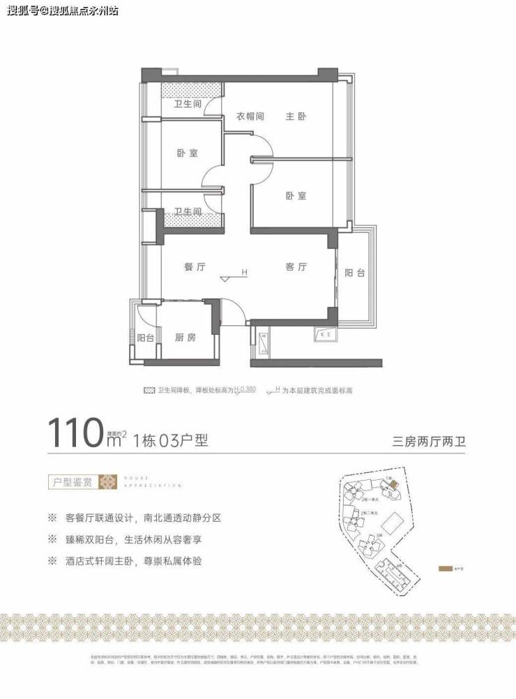 110㎡的3房2厅2卫,设计的是竖厅南北通透格局,三开间朝南,全屋飘窗设计,主卧大套间,U型厨房,还带1个小生活阳台,得房率约75%(不含赠送),客厅阳台主朝东南向。