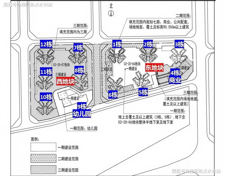 分为东、西两区开发,共10栋高层塔楼围合组成。其中东区包含1046户住宅,规划1065个车位。1、2栋为47层高楼,每层3梯6户;3、5栋为32层高楼,每层2梯6户;6栋为32层高楼,每层2梯5户;4栋为2层商业楼。