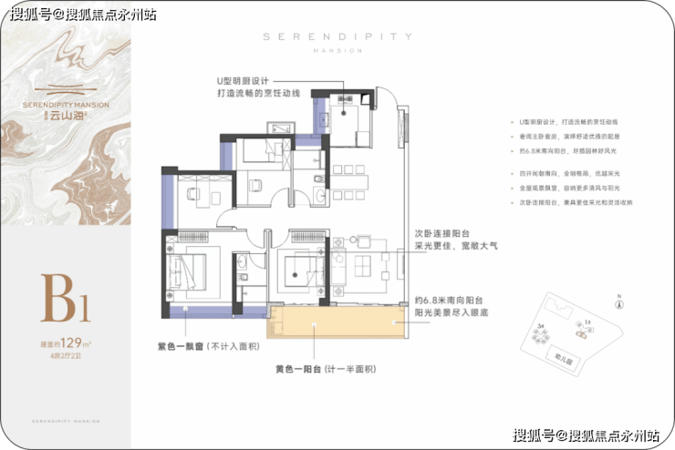 1栋单元住宅,2梯4户、2种户型,预计发售174㎡5房3卫户型,68套;129㎡4房2卫户型,64套;