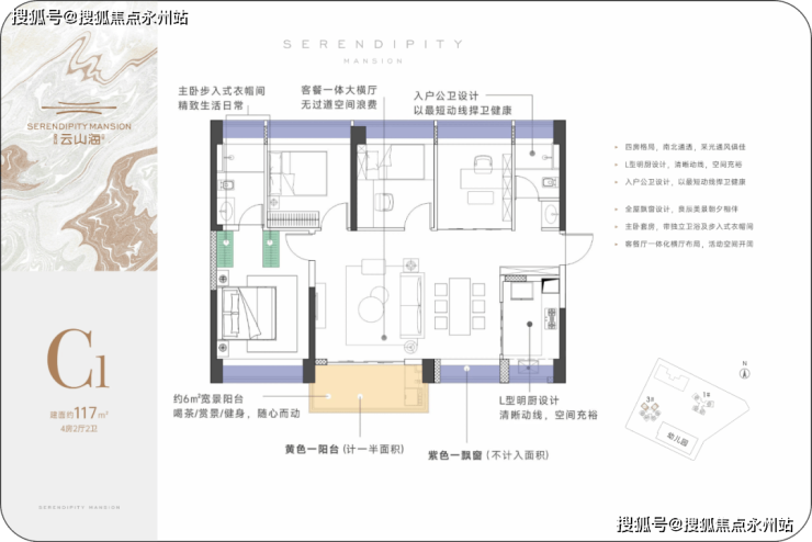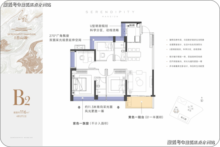 3.户型格局设计合理,朝向好,采光面较好,且赠送面积比较实惠。每 个户型的飘窗面积,据说不计入面积,客厅阳台一半的面积不计入房 产证。
