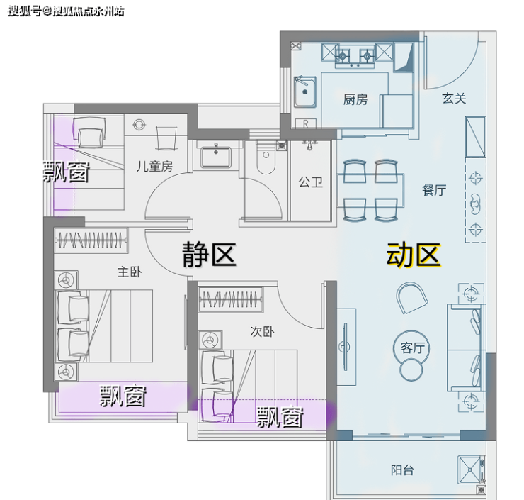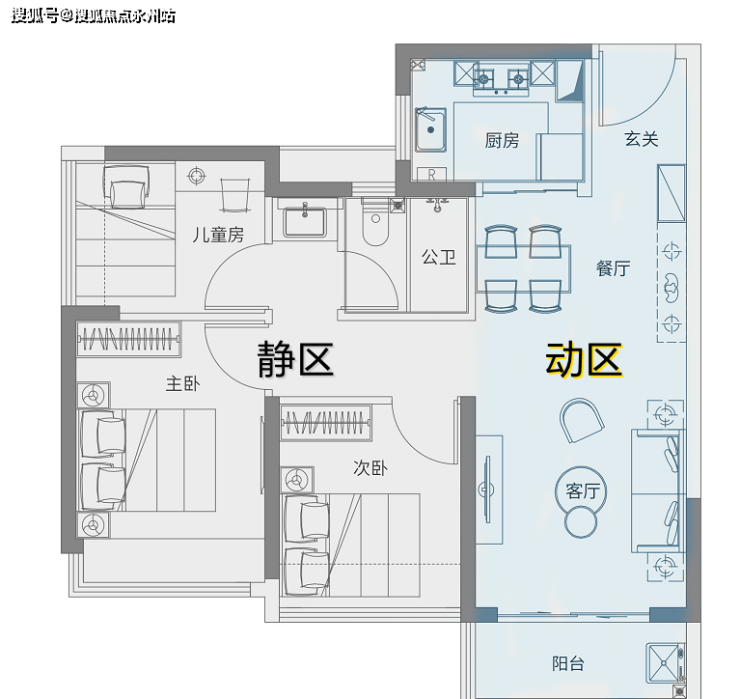 如图,这个“动区”的规格,与市面上的80/90㎡常规三房不相上下。