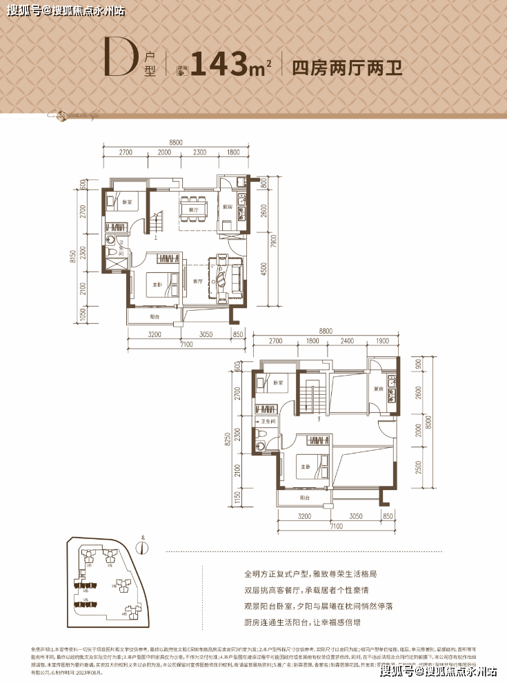 143㎡的复式4房2厅2卫,可以改5-6房没问题,客厅4.5米开间,挑高6.3米,一层两户,总高9-10层的小洋房,南北通透。