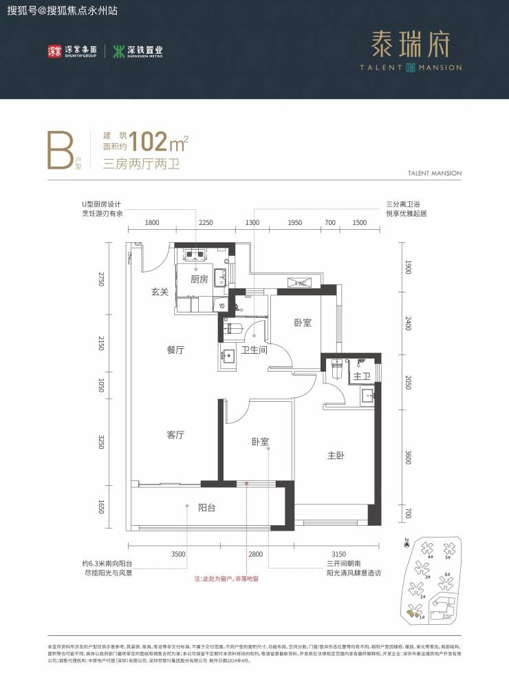 建面约 102㎡ 3 房 2 厅 2 卫:同样采用竖厅设计,客厅开间3.5米,三开间朝南,卧室尺寸分别为3.15米、2.8米、2.65米,6.3米长阳台连接客厅与次卧,U 型厨房搭配三段式分离卫生间,西南或东南朝向可选。