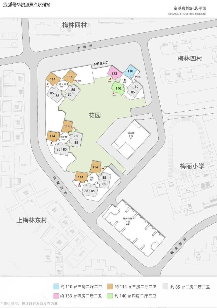 住宅总户数为1011户,其中回迁住宅户数为609户,面积61507m,可售住宅总套数为402套,面积38783m。住宅户型为建面约85m-143m2房至4房,套内面积小于90平米的户数为378户,