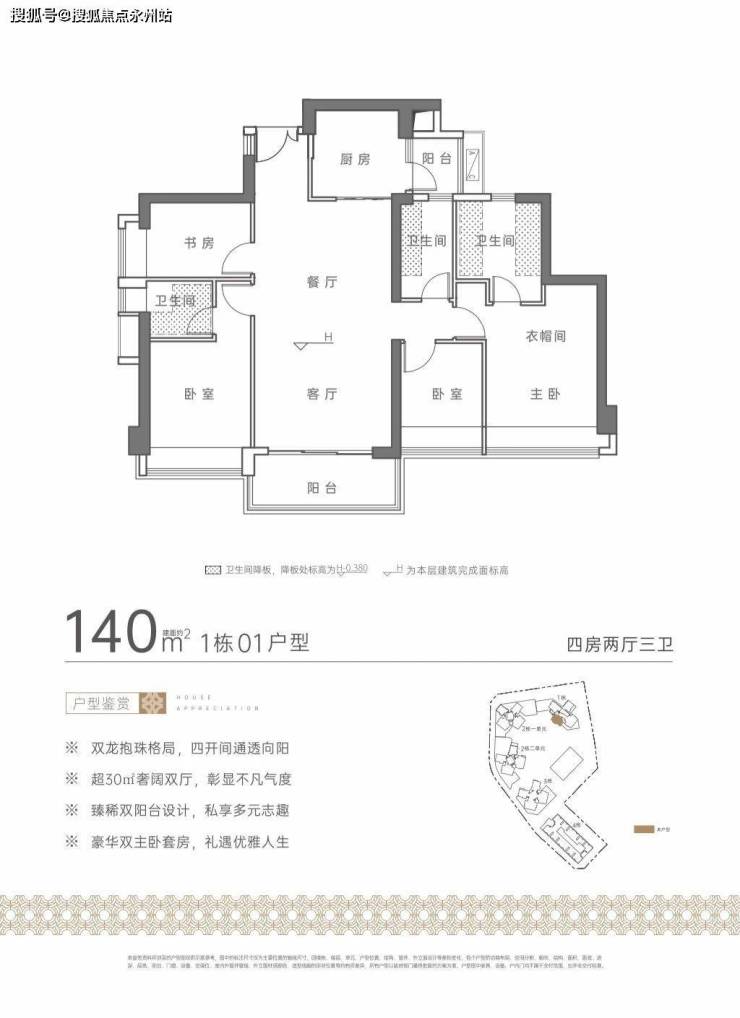 140㎡的4房2厅3卫,设计的是竖厅双龙抱珠格局,进门独立玄关,LDKB一体化设计,四开间朝南,双主卧套间,U型厨房,还带1个小生活阳台,得房率约75%(不含赠送),客厅阳台主朝西南向,看花园景观。