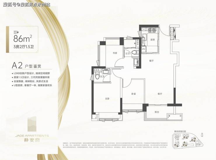 约86㎡3房1.5卫(1栋A座04/06户型、2栋03/05户型、3/4栋03/05/07户型)竖厅格局,餐客一体,动静分区结构,S型墙体预留冰箱位,创新型1.5卫设计,卫生间干湿分离设计,有东南、东北、西南朝向。