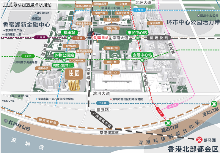项目位于福田中心片区,滨河大道和民田路交汇处东北侧,距离购物公园站约500米。