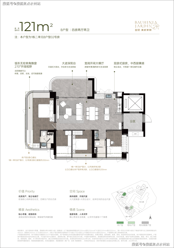 121平方米的户型为4房2厅2卫,采用横厅南北通透格局,专梯入户配有独立公区。LDKB一体化设计,动静分区,主卧为无柱弧形270°转角飘窗的大套间。客厅设有大进深阳台,厨房为洄游式中西厨房,公共卫生间三段式分离,得房率约92-100%(含赠送),阳台主要朝向西南或东南。