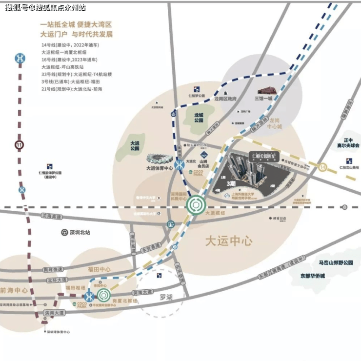 交通:【大运枢纽站】规划4轨于此交汇。3-14-16号线(已开通)33号线(建设中中6站直达机场),乘坐14号线可8站至福田,实现龙岗与福田快速通达。