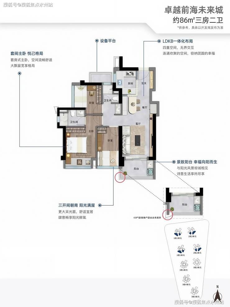 86平方米的三房两厅两卫户型,则是改善型住房的优选。三开间朝南的设计,保证了充足的采光和通风。主卧套房设计,带有独立卫浴,为居住者提供了私密、舒适的空间。