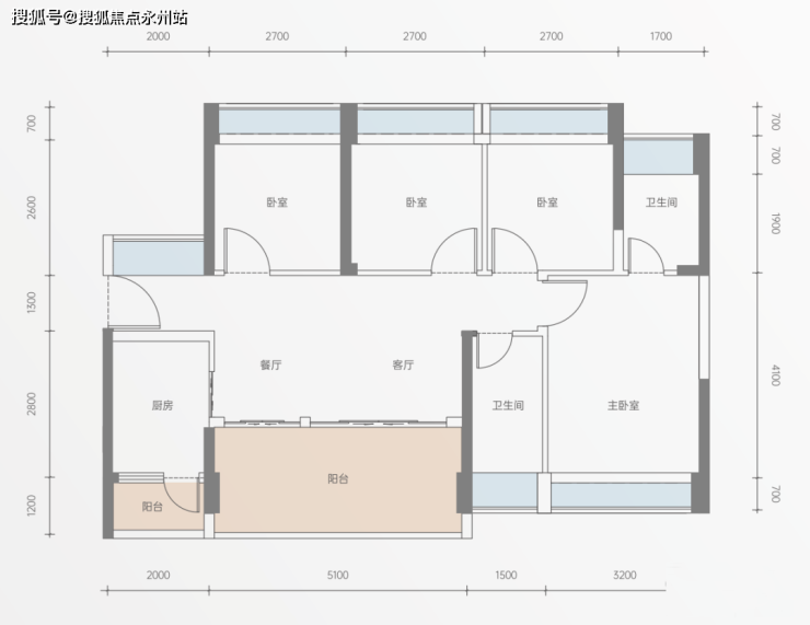 建面约89㎡3房2厅2卫:约5.3米开间大横厅,阔绰气派;主卧约3.2米宽飘窗;南向双阳台,兼得美学与实用。