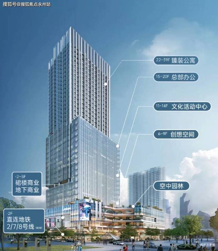楼层分布合理,共39层,-2至5层为地下及裙楼商业,6-9层为商业,15-20层为办公,22-39层为公寓,多功能一体化设计,满足不同需求!