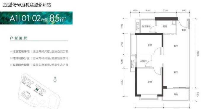 85㎡的2房2厅1卫:设计的是竖厅格局,客厅3.35米开间,进门入户玄关,LDKB一体化设计,2个卧室分别做到了3.6米/2.7米的宽度,L型厨房还带1个小生活阳台,卫生间干湿分离,得房率:75.66%(不含赠送),阳台朝西南向。