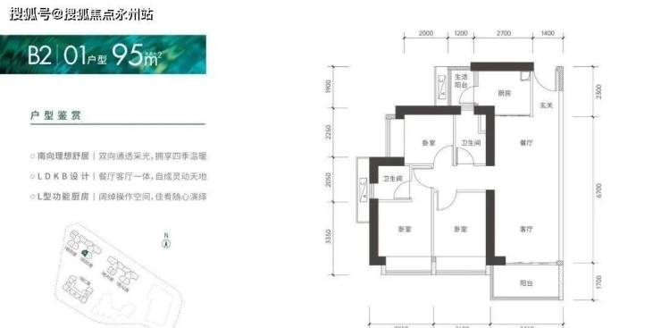 95㎡的3房2厅2卫:仅1栋B2座01户型,设计的是竖厅格局,客厅3.35米开间,进门入户玄关,LDKB一体化设计,3个卧室分别做到了2.95米/2.6米/2.25米的宽度,L型厨房还带1个小生活阳台,卫生间干湿分离,得房率:75.66%(不含赠送),阳台朝西南向。