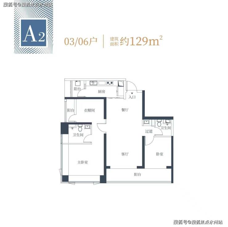 129㎡3房2卫A2户型:竖厅双龙抱珠格局,相比A1户型阳台更大一些,直接连通到次卧,东南朝向,得房率在77%左右。