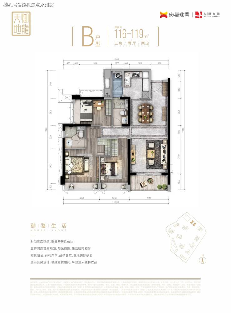 B栋56层4梯6户,01、03、04、06是116-119㎡三房;02和05是103-106㎡三房;