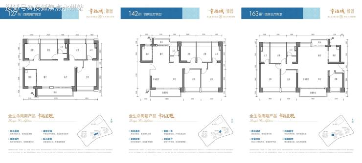 114-127㎡四房两厅两卫:横厅/竖厅设计,部分四开间朝南,得房率约84.87%-87.1%。