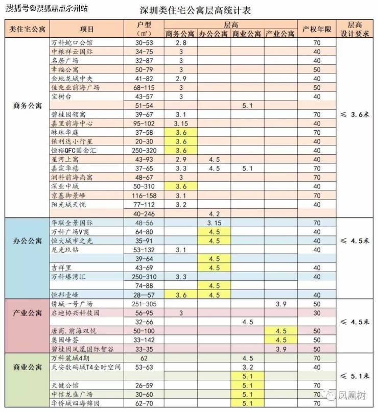 作为商品房的各类公寓,在项目报建时,必须根据深圳的建筑设计规范,设计公寓产品的层高。深圳各类房屋的层高上限:住宅 3.6米,商务公寓 3.6米,办公产品 4.5米,厂房 4.5米,商业一层6米,其上楼层 5.1米。