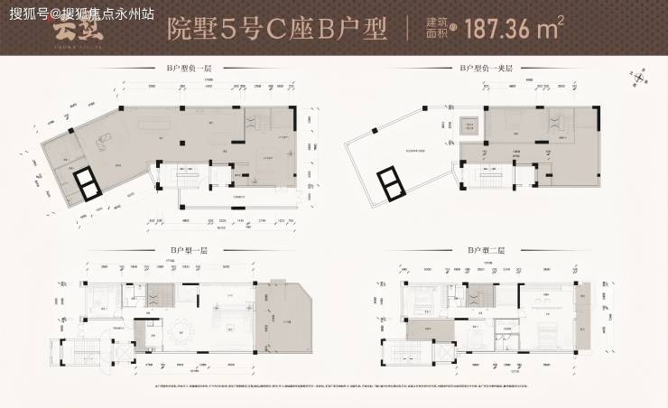 举个例子1:187㎡户型,1-2层下叠户型,赠送前庭后院,还有二层空间地下室。