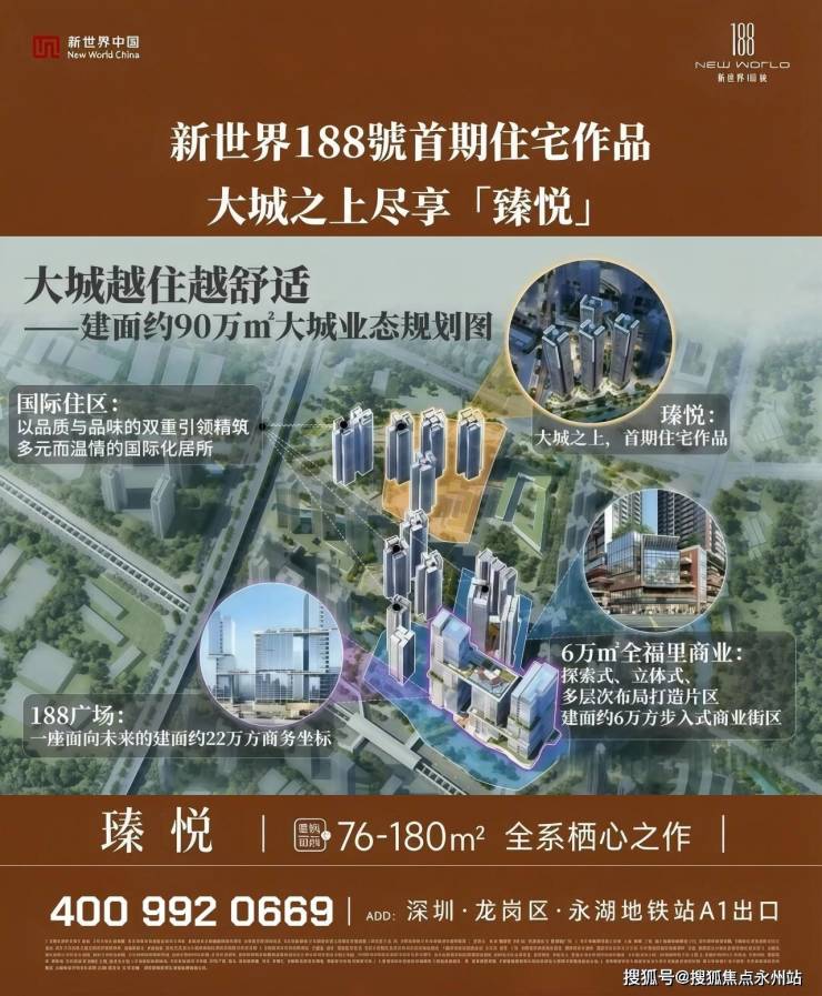 新世界188号(备案名:新璟曜广场)是新世界集团首进龙岗打造的标杆力作,项目前身为横岗188工业区城市更新单元。定位“90万㎡都会有机互联体”,以“产城融合、生态宜居、TOD便捷”为核心,打造涵盖住宅、商业、办公等多元业态的全周期生活大城。如需了解更多详情,欢迎咨询龙岗新世界188号售楼处电话:400-992-0669,过来我们营销中心看房提前来电预约价格还能更优惠。